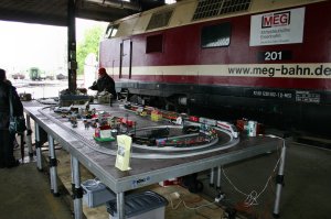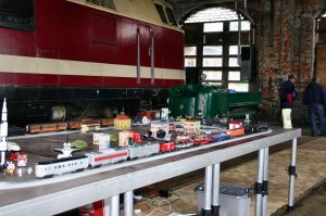 Am 28. und 29.09.2013, fanden bei Geraer Eisenbahnwelten www.geraer-eisenbahnwelten.de die Verkehrshistorischen Tage 2013. Bei super schönem wenn auch kalten Herbstwetter kamen sehr viele Besucher. Diesesmal stellet ich meine Anlage nicht im Lokschuppen aus, dieser war mit den Originalen belegt, in der kleinen Turnhalle des ehemaligen BW Gera aus. Auch war die Bühne etwas kleiner ausgefallen, nur 2x4 Meter, so konnte ich nicht wie geplant lange Züge fahren wie sonst. Den Besuchern und vor allem für die Kinder war es ein Spaß nicht nur einmal die Bahn rollen zu lassen sonder auch einmal einige kleine Effekte selbst zu probieren. Anbei einmal einige fotografische Impressionen. |