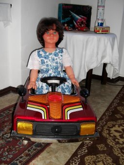 Ein Tretauto, eines der größten "Blechspielzuge" ihrer Art. Tretautos sind so alt wie das Automobil selbst. Sie sind ihren großen Vorbildern gut nachempfunden. Tretautos gibt es noch heute, namhafte Automobilproduzent lassen heute Tretautos in ganz geringer Stückzahl herstellen. Die Tretautos welche es in der DDR geben hat, stammten aus den 50 Jahren, später wurde keine mehr hergestellt. Die meisten heute erhaltenen Tretautos stammen größten teils aus der Sowjetunion und stellten die entsprechenden Modelle der Originale dar. So gab es den Lada, den Moskwitsch oder den Wolga. Das auf dem Bild darstellte Tretauto hat große Ähnlichkeit mit Lada aus den späten 80 Jahren des 20 Jahrhunderts, die Farbgebung entspricht dem heutigen Trend für Spielzeug, bunt und farbig nicht mehr wie die Vorbilder von Damals. Die Fahrerin ist eine "Lissy Doll". |